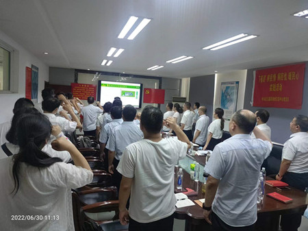 尽心竭力办实事,党旗高扬映初心.参观活动结束后,全体党员开展联合支部主题党日,大家高举右臂,宣读入党誓词,总支书记、主任吴萍为六月份过政治生日的党员颁发了生日贺卡,寄语大家“革命人永远年轻”。
